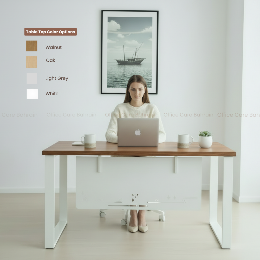 This modern office desk is designed to bring simplicity, function, and style to any workspace. Built with a strong, powder-coated steel frame, it offers a stable and durable foundation for everyday use. The customizable table top—available in white, oak, walnut or light grey—lets you match your office style effortlessly. Perfect for workstations, home offices, or corporate setups, this desk adds a clean, modern touch while giving you the space you need to stay productive.